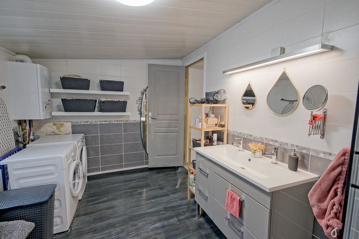 Le premier étage accueille une chambre, dotée d’un espace dressing, et une salle de douche bien agencée, avec un emplacement pour une machine à laver et un séchoir.