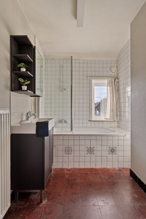Op de tweede etage vinden we de badkamer en 3 kamers, waarvan 2 grote en 1 kleine. De badkamer beschikt over een lavabo en bad/douchecombinatie.