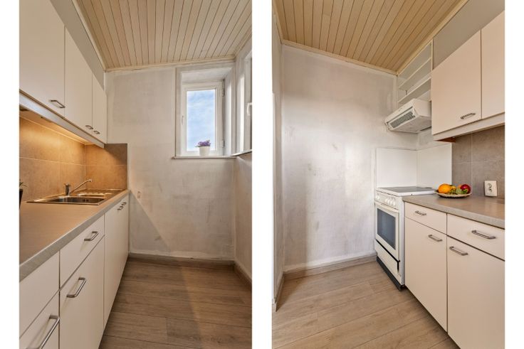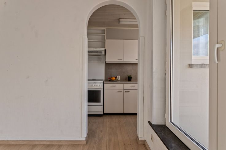 Op het eerste treffen we een ruime, heel lichtrijke living. De voorgevel bestaat quasi volledig uit vensters. Dit zorgt ervoor dat u vanuit de hoogte het leven beneden in alle rust kan gadeslaan. Ook langs de achterkant van de leefruimte is er een groot raam. Van hieruit kunnen we ook op terras en hebben we zicht op de tuin. De keuken is langs de achterzijde gelegen. Op deze verdieping is er ook nog een toilet.