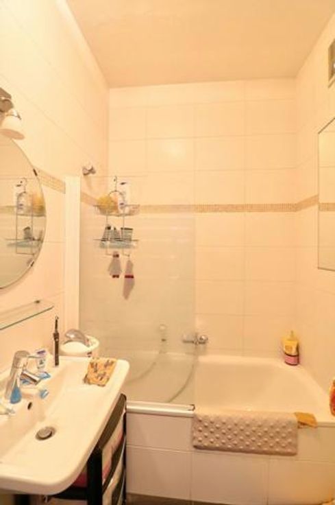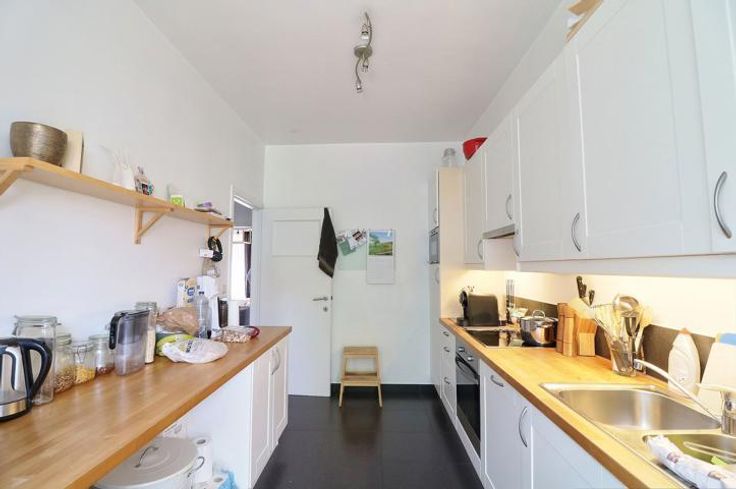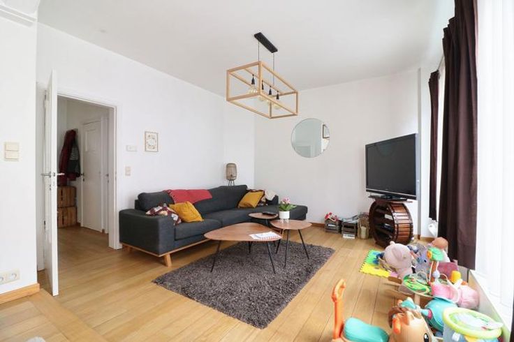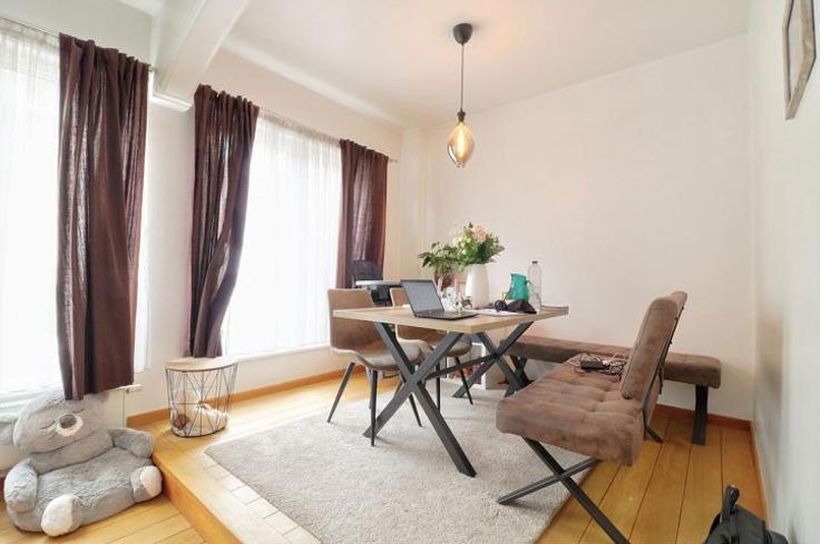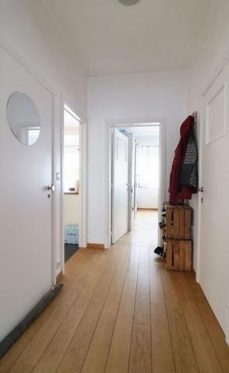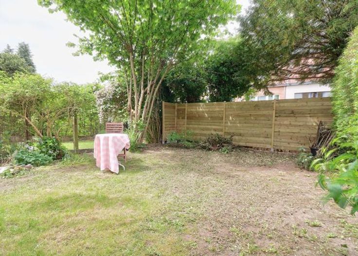 Gelegen in een rustige en groene omgeving, mooie gelijkvloerse flat van -+ 70m² in een huis. Het appartement is volledig gerenoveerd en bestaat uit een slaapkamer van 15m², badkamer, bijkeuken in de garage, mooie woonkamer van +- 25m² met eiken parketvloer + een ingerichte keuken, terras en kleine tuin op het zuiden van +- 70m², 2 kelders, 1 kleine garage (+150€) indiv chff, geen lift.
