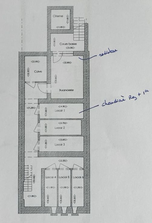 Sous-sols : 7 caves + buanderie pour le rez . Adoucisseur d'eau pour tout l'immeuble, chaudière au gaz du rez et 1er étage