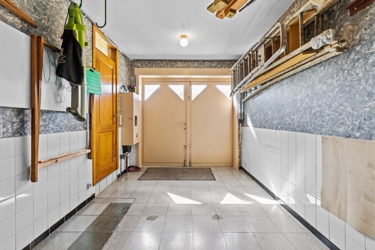 Gelijkvloers: Inkomhal met gastentoilet, ruime en lichtrijke leefruimte, zithoek met tuinzicht, knusse tv-hoek, volledig uitgeruste keuken met eethoek, praktische berging en ruime inpandige garage (18 m²).