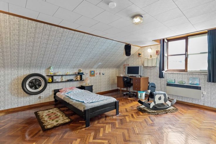Tweede verdieping: Imposante derde slaapkamer (30 m²) met zolderruimte, perfect als master bedroom, gastenkamer of speelruimte.