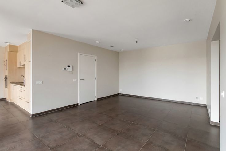 Via de lift of de trap betreden we het appartement , het gastentoilet bevindt zich in de hal. Aansluitend is er een leefruimte met open keuken.