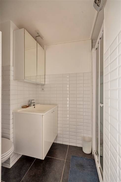 Het studio beschikt over een nette badkamer met strakke afwerking en voldoende opbergruimte. De warme houten vloer creëert een gezellige ambiance in de leefruimte en gang.