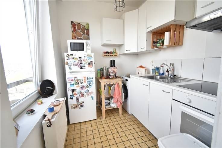 11ème étage : hall d'entrée(+/-7 m²), lumineux séjour (+/-23 m²), cuisine équipée (+/-5 m² avec taque vitrocéramique, four, hotte, meubles évier et de rangement, emplacement machine), hall de nuit avec placards (+/-4 m²), 2 chambres (+/-16 et 11 m²), salle de bains (+/-4 m² avec douche et lavabo), w.c. (+/-1 m², sol carrelé) .