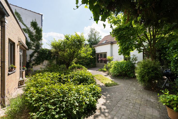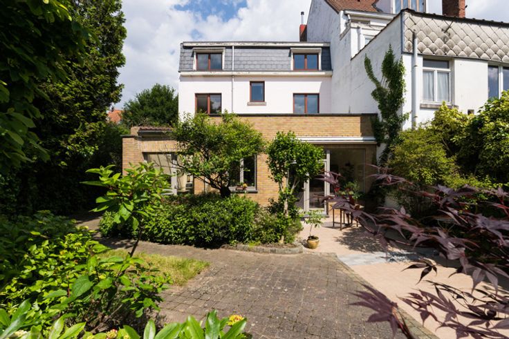 UKKLE, wijk Calvoet, op een boogscheut van het Lycée Français, karaktervol WOONHUIS (6slpkm/1kantoor/2bdkm) van ±294m² en charmant WOONHUIS van ±115m² op een perceel van 6a20ca en met een voorgevelbreedte van 12 meter. Buitenparkeerplaatsen. Gebouwd in 1933, is het als volgt samengesteld: Op de begane grond (±120m²), grote inkomhal met porte cochère van ±19m² en natuurstenen vloer, daghal met vestiaire, toilet en traphal, aangename woonkamer bestaande uit 2 kamers op een rij (±18m² - 14m²), veranda omgebouwd tot bureau van ±10m², eetkamer van ±23m² en ingerichte keuken. Koetspoort die toegang geeft tot de mooie binnenplaats aan de achterzijde, atelier en stadstuin op het zuiden met moestuin en fruitbomen. 1e verdieping (±70m²), plat dak/ mezzanine terras, nachthal, drie slaapkamers (±22m², ±14m² en ±12m²), badkamer met ligbad, dubbele wastafel en wc. 2e verdieping (±70m²): nachthal, drie slaapkamers (±19m², ±14m² en ±12,7m²), doucheruimte met wc en keuken. Souterrain (±70m²): diverse opslagkelders, stookruimte, toilet en badkamer. Achterhuis (±115 m²): volledig gerenoveerde werkplaats op 2 niveaus met keuken en kelder, individuele technische uitrusting. EPC : G. Houten ramen met dubbele beglazing. Het dak van het atelier is gerenoveerd en geï