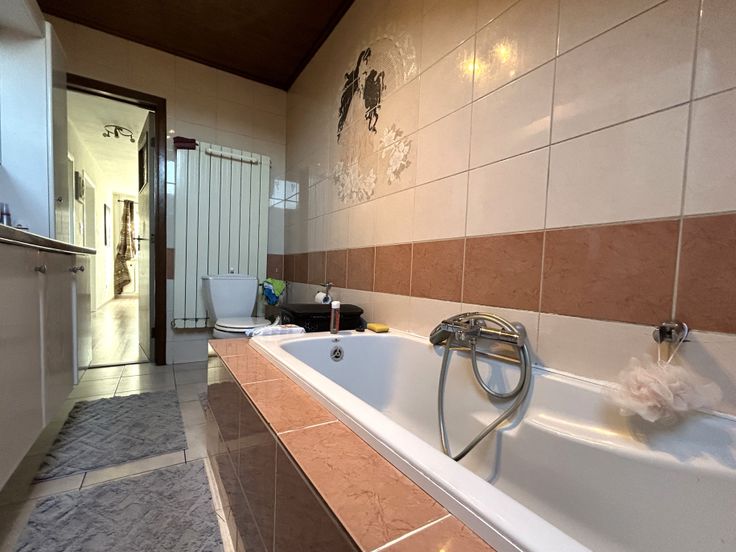 Au rez-de-chaussée, le hall d’entrée qui dessert un living avec cassette au bois de +/- 32m², une cuisine équipée (LV, Four, vitro, hotte) de +/- 24.5m² et un WC séparé.