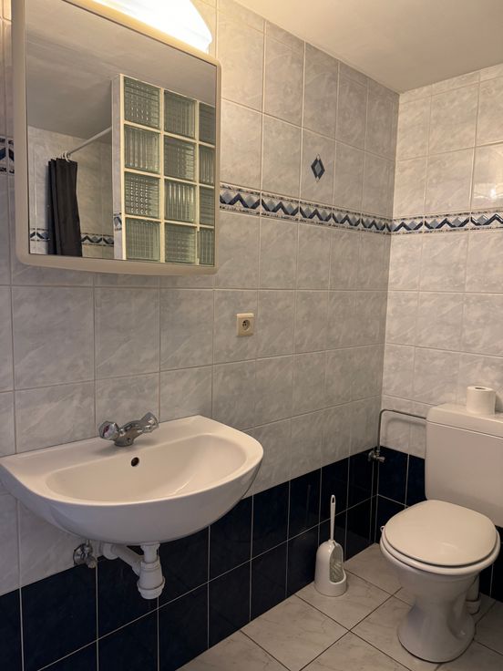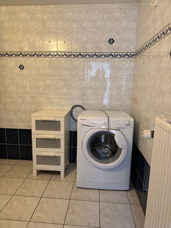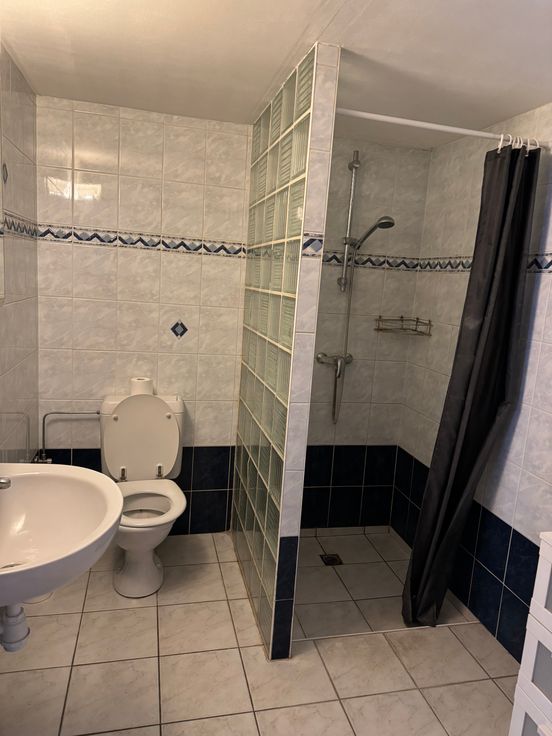 Salle-de-douche au rdc, avec douche, toilette, lavabo et lessiveuse fonctionnelle.