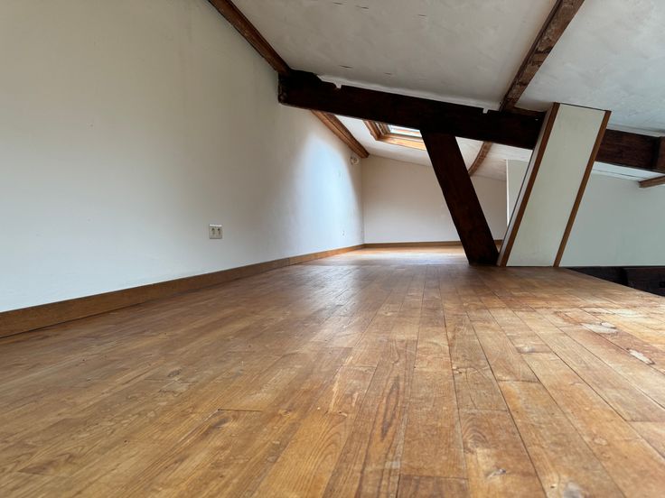 Mezzanine mansardée qui fait office de chambre.