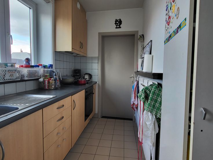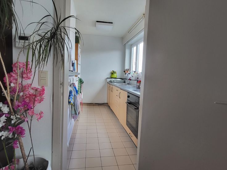 Het appartement omvat: inkomhal met vestiaire, woonkamer in laminaatparket, keuken voorzien van vitrokeramische kookplaat, dampkap en oven, zeer grote wasplaats/berging, badkamer met ligbad en douchekraan, enkele lavabo, apart toilet, 3 slaapkamers en terras achteraan uitgevend op groene omgeving.