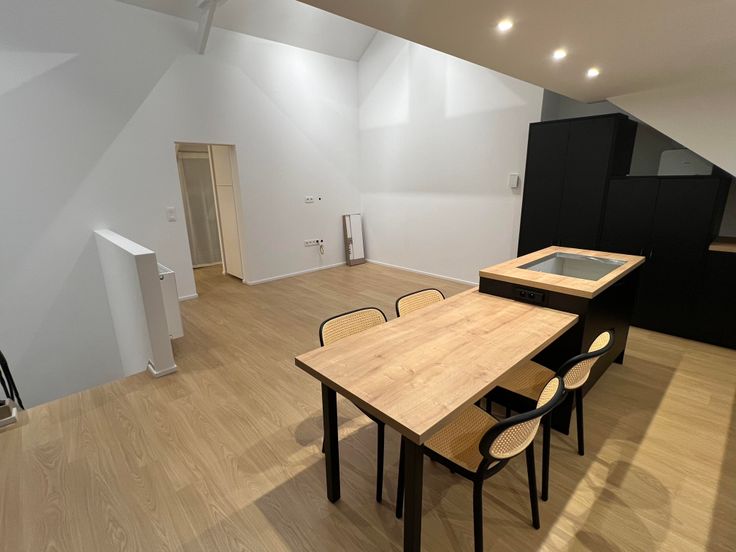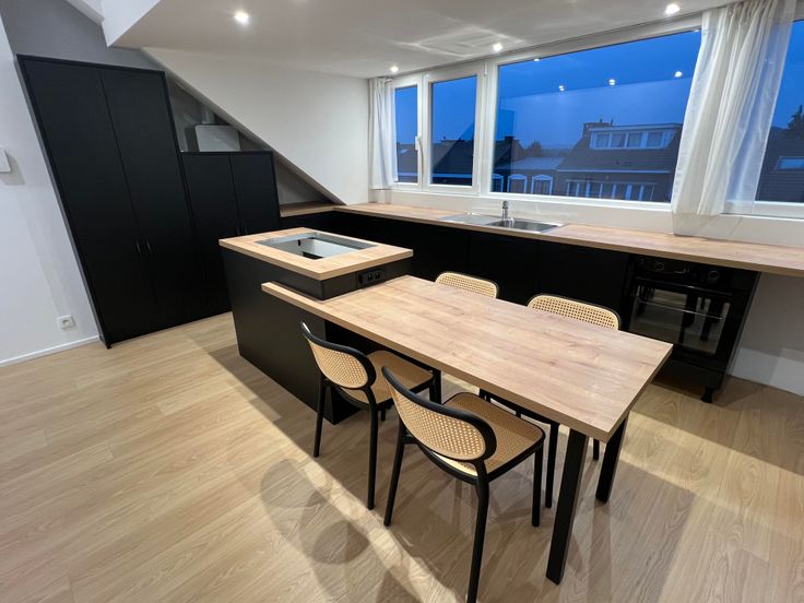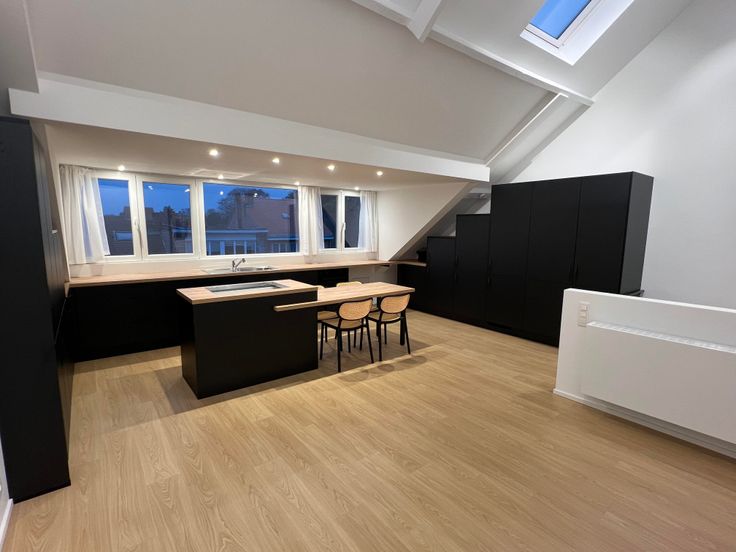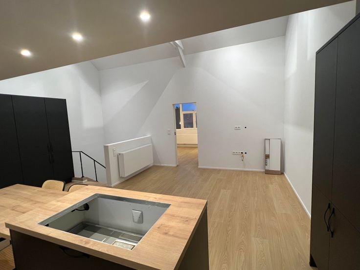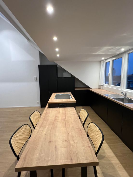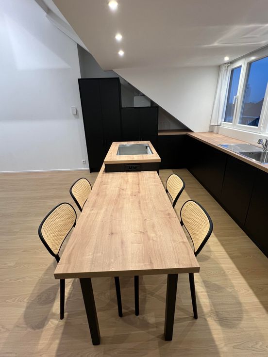 L'appartement se compose d'un escalier privatif à partir du 3ème étage, d'un grand salon avec cuisine américaine hyper équipée en forme de U ( taque électrique avec hotte intégrée, frigo, congélateur, lave-vaisselle, four, lave linge et sèche linge) + ilot central avec table intégrée.
