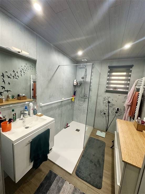 Comprenant: au rez: hall d'entrée, 2 wc, spacieux séjour (scoin salon avec poêle à pellets et SAM avec accès à la terrasse, cuisine équipée, salle de douches, 2 chambres (14 et 15 m²),