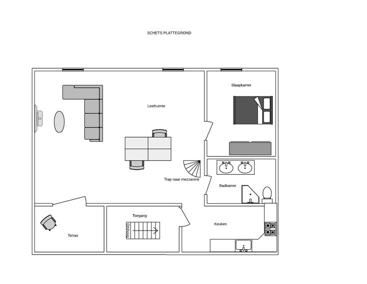 1 slaapkamer en een mezzanine die gebruikt kan worden als slaapkamer of bureau toegankelijk via wenteltrap.