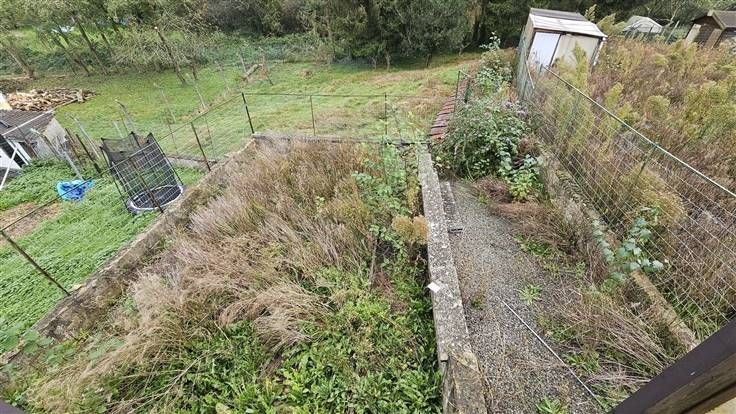 Rez: Living, cuisine, salle de bains, terrasse, jardin en contre-bas.