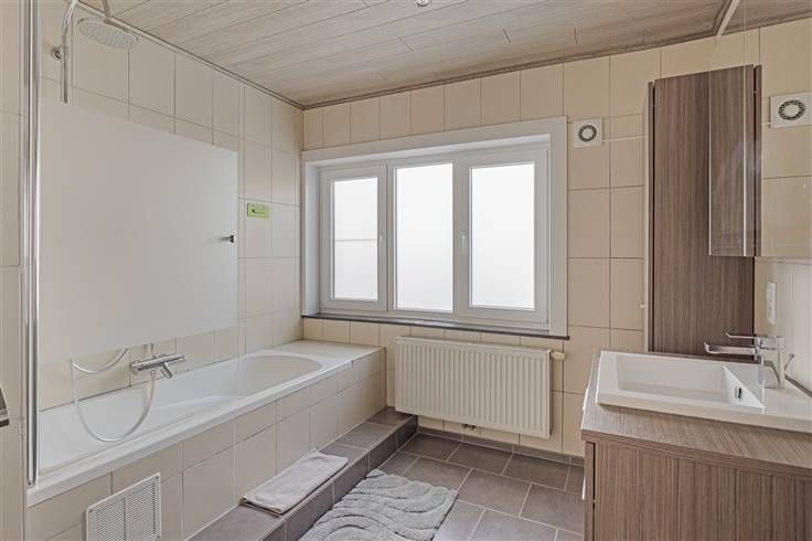 Op de eerste verdieping bevinden zich nog twee ruime slaapkamers (12m² en 15m²) en een badkamer (8,50m²). De badkamer is voorzien van een douche-bad, een lavabo en een tweede toilet.