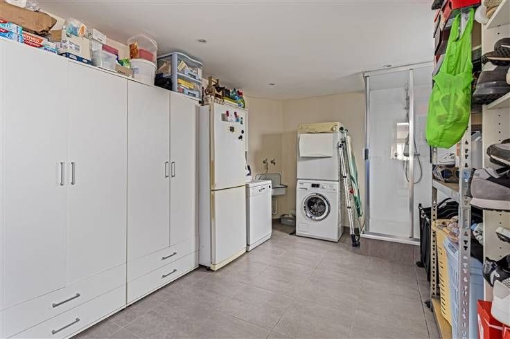Achter de keuken is er een ruime berging (14m²) met aansluiting voor wasmachine en droogkast en een douchecabine. Verder is er ook nog een eerste apart toilet voorzien op het gelijkvloers.