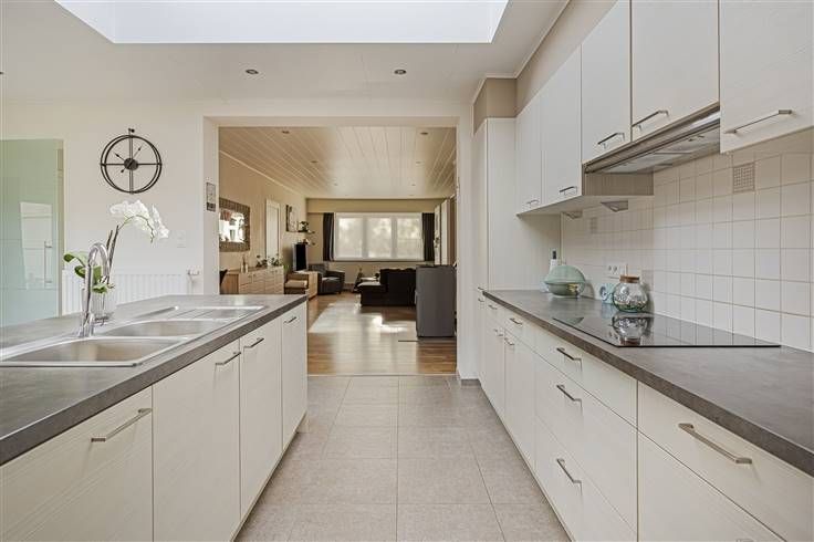 Aansluitend aan de woonkamer bevindt zich de ruime halfopen keuken (40m²). De keuken is voorzien van al het nodige comfort: er is een kookvuur met dampkap, een dubbele spoelbak, een afwasmachine, een microgolf, een oven en een ingemaakte frigo. Er is voldoende ruimte voor een grote eettafel.