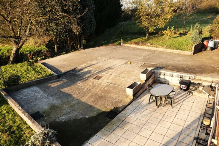 Une terrasse carrelée longe la façade avant. S'en suit une cour avec places de parking.
