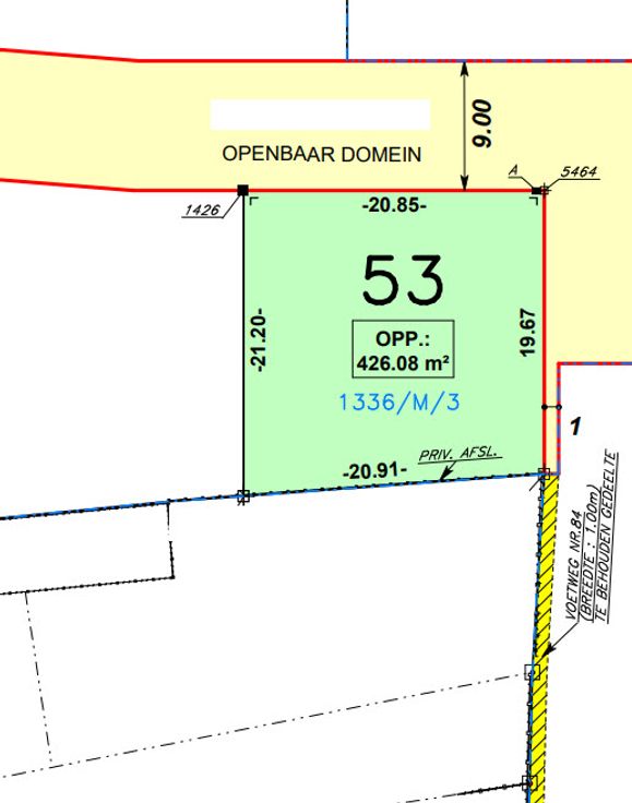 De grond heeft een totale oppervlakte van 426 m² (lot 53), een straatbreedte van +/- 21m (hoek) en een perceeldiepte van +/- 20m. De bouw van een woning staat ingetekend met een breedte van 9 m en een diepte van 10 m, met tuinzone rondom. De bouwvrije stroken zijn 3 m. Kroonlijsthoogte maximum 6 m en nokhoogte 12 (gemeten vanaf de 0-pas).