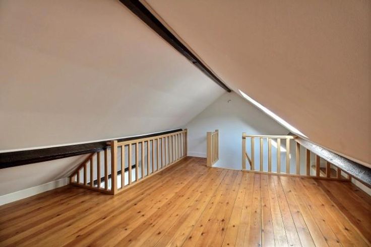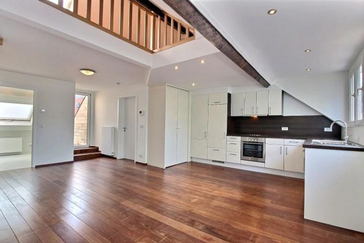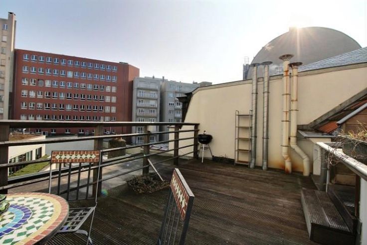 A proximité du Rondpoint Schuman, des institutions européennes, des commerces, et des moyens de transport, au dernier étage d'un petit immeuble sans ascenseur, bel appartement 1 chambre-à-coucher avec terrasse. Cet appartement se compose d'un vaste espace (living et salle-à-manger) ouvert sur une cuisine super-équipée, d'une salle de bains (avec possibilité de connecter un lave-linge), d'une chambre en mezzanine. Très agréable terrasse de 16 m² en façade arrière (calme). Cave. Faibles charges (50 euros pour l'entretien et l'électricité des communs).