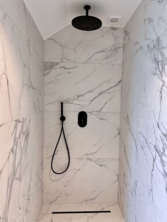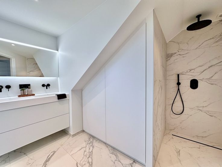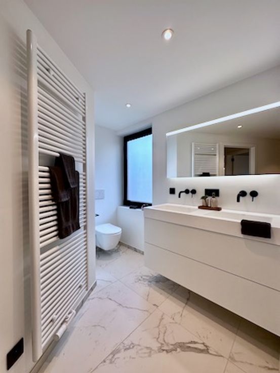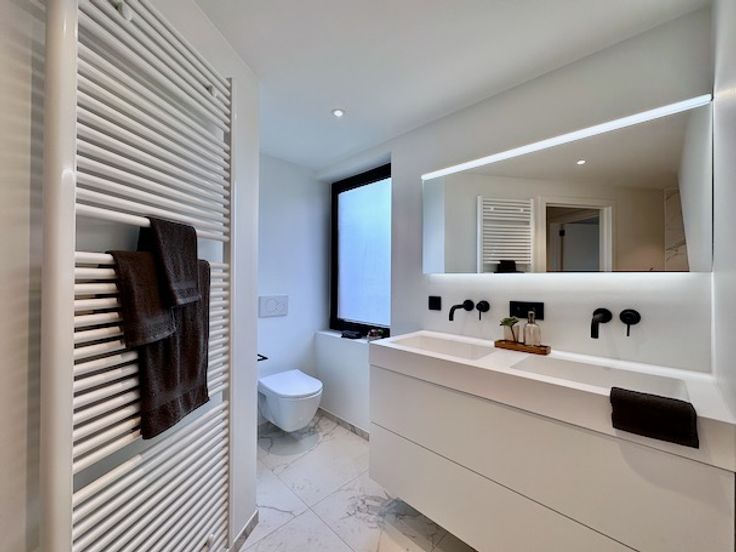 Badkamer met inloopdouche, dubbele lavabo + kasten, toilet en handdoekwarmer.
