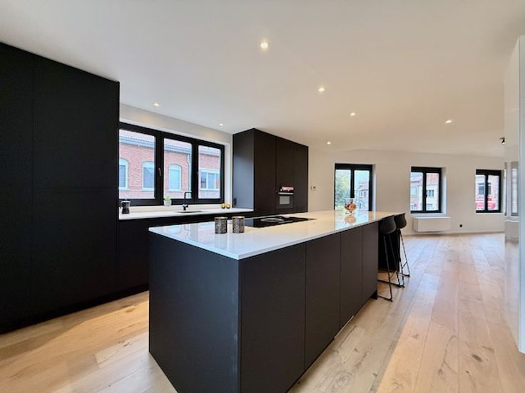 De prachtig gerenoveerde woning, HOB (200 m² bew. opp.)ligt op een absolute toplocatie (mobiscore 8,6/10) en bestaat uit: Beneden een, mogelijke handelsruimte van 40 m² of 2 slaapkamers, garage met aut. sectionale poort, Z-stadstuintje van 20 m² met zij ingang, kelder van 10 m² en erboven een 2 slk duplex.