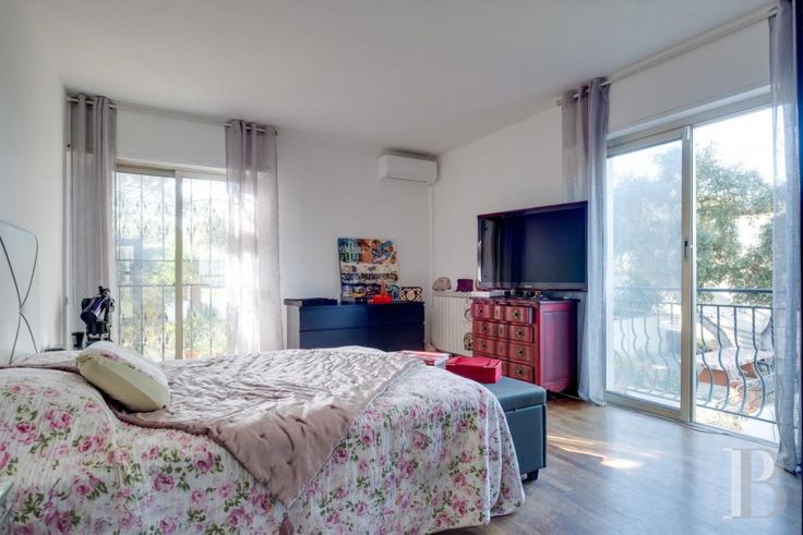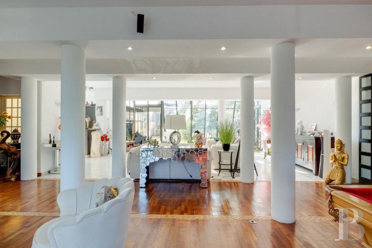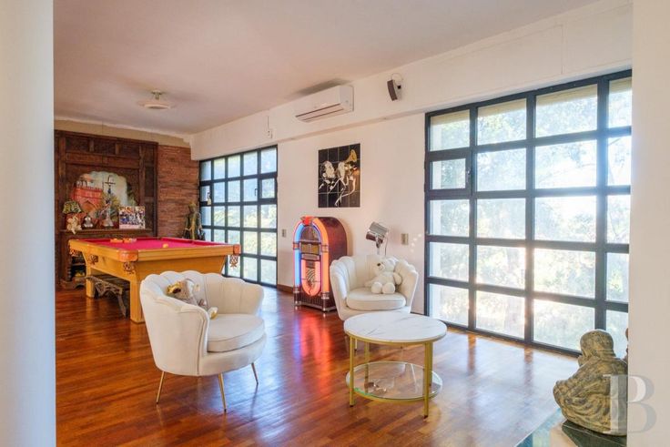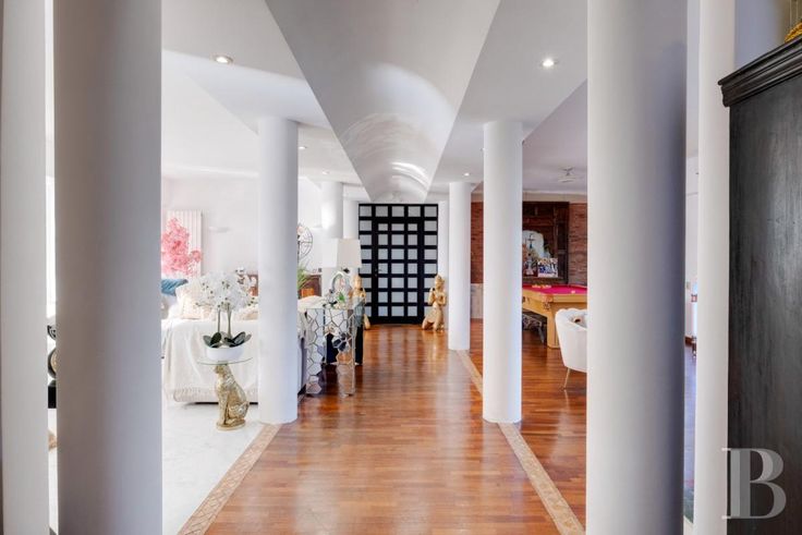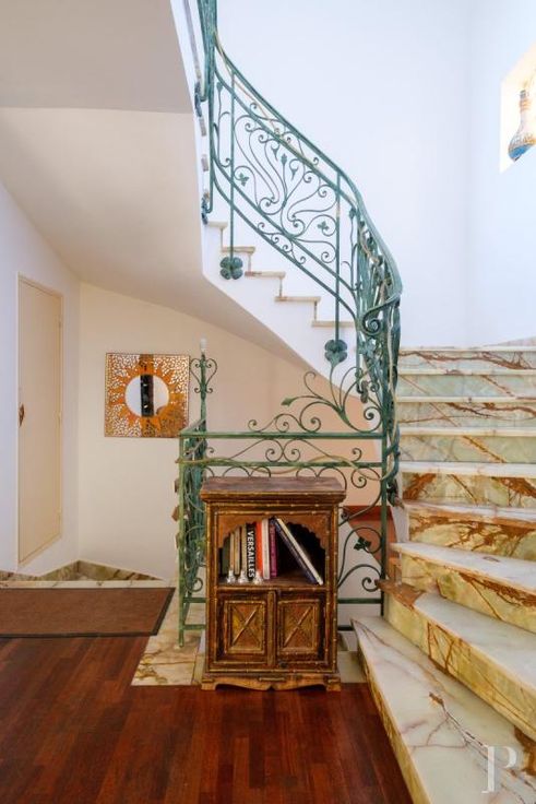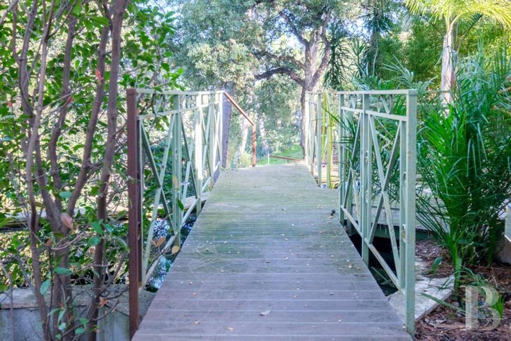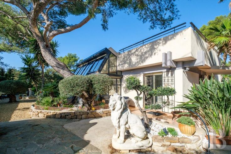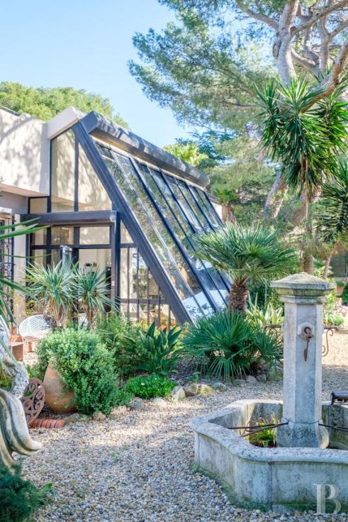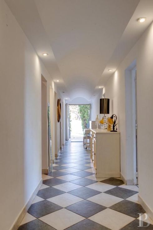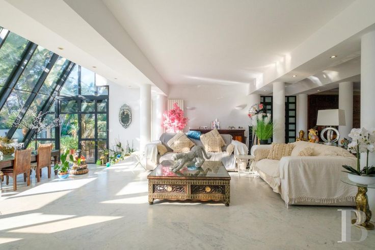 Un gigantesque salon inondé de lumière par la verrière se trouve en rez-de-jardin, aux côtés d'une cuisine et de la chambre principale avec ses commodités, alors que quatre autres chambres et pièces associées se situent au niveau inférieur, qui toutes ouvrent sur des terrasses accédant au jardin. Le terrain est constitué de plusieurs restanques arborées de chênes-lièges, de pins, de palmiers, d'oliviers et de figuiers. Les restanques les plus larges abritent un espace repas avec four extérieur pour