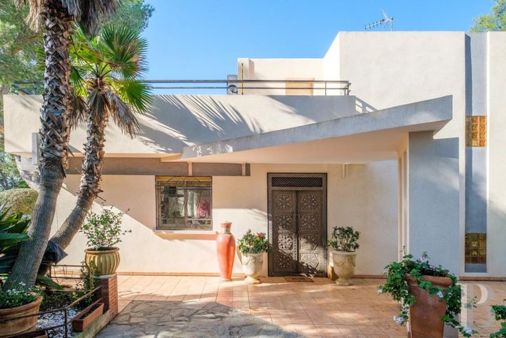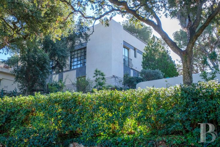Depuis un chemin goudronné, l'entrée dans la propriété s'effectue par un portail électrique en métal plein doublé d'arabesques en fer forgé. Une allée dallée en pierre conduit au porche de la maison sur la gauche et vers un grand garage en continuant tout droit. La villa, construite en 1967 sur environ 370 m² habitables, consiste en une grande bâtisse rectangulaire de trois niveaux qui épousent le terrain en restanques, le niveau supérieur étant constitué par un vaste toit-terrasse, de plus de 150 m² utiles, avec aperçu mer. Les murs extérieurs sont enduits de blanc, les menuiseries constituées de larges fenêtres ou de portes-fenêtres en aluminium, avec stores électriques et grilles en fer forgé noir pour les issues en rez-de-jardin. Une très large verrière orne la façade sud tandis qu'un auvent triangulaire protège la porte d'entrée.