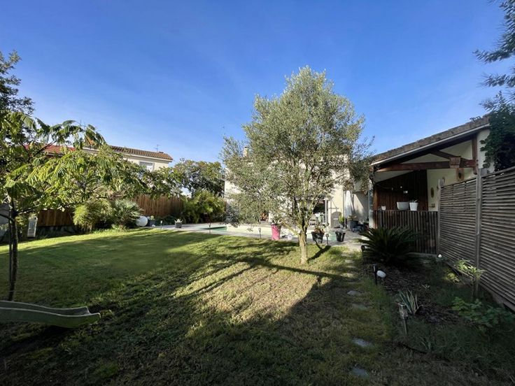 33110 - LE BOUSCAT - L'ERMITAGE. C'est à moins de 10 min A PIED du PARC DE L'ERMITAGE que prend place cette maison en RETRAIT DE RUE de 2016 avec JARDIN, PISCINE et GARAGE. Elle propose une CUISINE AMERICAINE entièrement EQUIPEE s'ouvrant sur une VASTE PIECE DE VIE TRAVERSANTE et son poêle à bois, créant une ambiance chaleureuse et conviviale. Imaginez-vous prendre vos repas face à une terrasse ensoleillée, un très beau JARDIN PAYSAGE de près de 300m² et une PISCINE 8m par 4m TOUTES OPTIONS (au sel, chauffée, régul pH, volet immergé) qui n'attend que vos moments de détente et de plaisir. Le rez-de-chaussée offre également une flexibilité précieuse grâce à une pièce pouvant servir de bureau ou de chambre d'amis, ainsi qu'une buanderie et un WC.