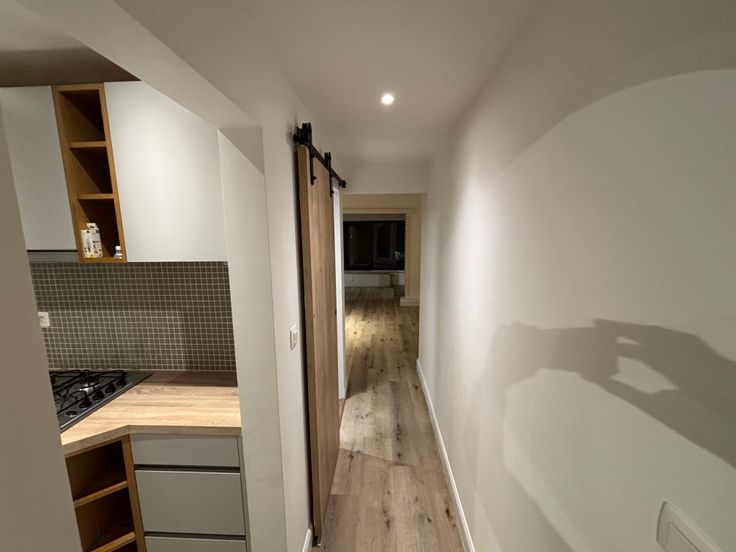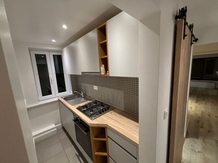 Salon-Salle à manger. Un petit couloir vous conduit à la cuisine qui contient taque au gaz, four électrique, frigo et compartiment congélateur. évier et armoires de rangement. La pièce suivante est la salle de douche avec lavabo, WC suspendu. La chambre à coucher est spacieuse. Tout derrière une verranda vous offre différentes possibiliés.