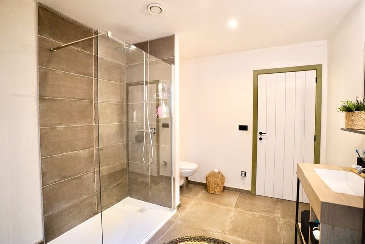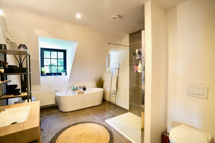 - Moderne ruime badkamer met bad als inloopdouche en toilet;