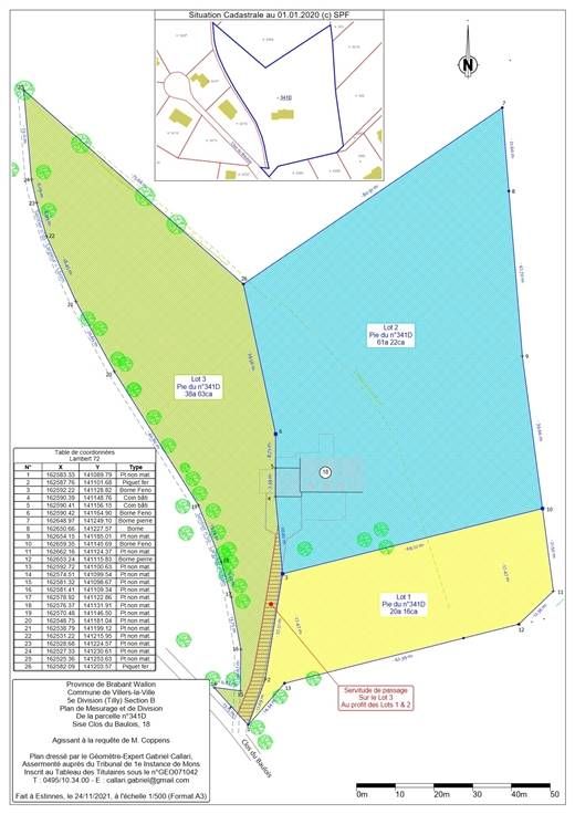 GROEN PERCEEL OP PLAN. Uitzonderlijke ligging van dit perceel als gevolg van de splitsing van een prachtig landgoed. Het perceel ligt op een steenworp afstand van Bois Cochet, in de Clos du Baulois, en ligt deels in een woonzone en deels in een landbouwzone. Het perceel van 38a63ca dat wordt verkocht is kavel 3 van de verdeling die in groen is aangegeven op het plan van de landmeter. Breedte vooraan: 27,51 meter. Diepte links: 69,22 meter. Diepte rechts: 74,75 meter. Breedte aan het einde van het perceel: 21,50 meter. De landbouwzone begint bij de stippellijn op het plan. Er moet natuurlijk een voorontwerp worden ingediend bij de dienst stedenbouw. De boer heeft het perceel verlaten. Een unieke en zeldzame situatie op dit moment! Een bezoek is een must, het voelt als vakantie, als zenitude, als welzijn! Je zult versteld staan! Op een steenworp afstand van de hoofdwegen, VLV STATION! Volledige beschrijving exclusief op www.valdelimmo.be ! Meet- en afbakeningskosten ten laste van de koper.