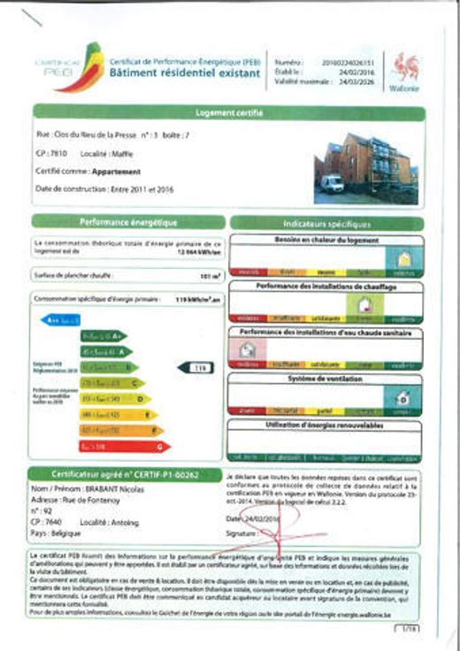 !!! SOUS COMPROMIS !!! Votre bureau IMMO CHRONO a le plaisir de vous proposer en exclusivité ce superbe appartement construit en 2016. Niché dans un clos paisible, cet appartement tout confort de 106m² situé au 2ème étage avec ascenseur vous charmera par sa luminosité et son agencement pratique. Il se compose d'un hall d'entrée avec wc séparé, un séjour lumineux avec balcon, une cuisine équipée , une buanderie, une chaufferie, une salle de bains avec baignoire, un hall de nuit et deux chambres. L'appartement dispose de son emplacement parking privé. Confort: Chauffage par le sol, VMC, Châssis double vitrage PVC, compteur électrique bi-horaire, ouverture sécurisée par vidéophonie. Revenu locatif actuel: 825€/mois. Prix : faire offre à partir de 230.000€ - Frais d'agence 6.000,00€ TVAC non inclus à charge de l'acheteur. (sous réserve d'acceptation des propriétaires vendeurs) Renseignements et visites: Gabrielle 0499/87.43.23. Publicité à caractère indicatif et non contractuel.
