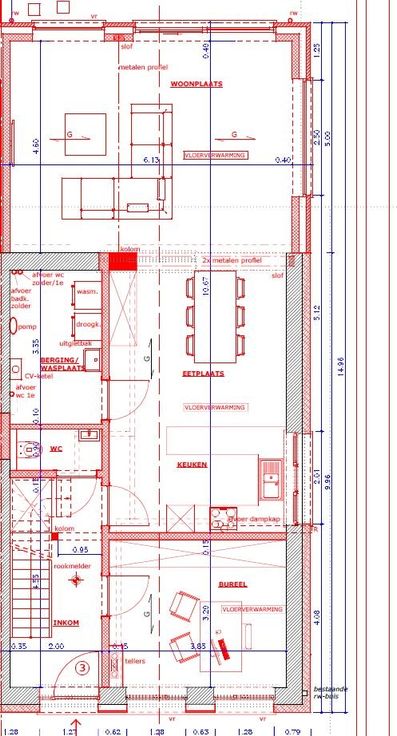 Gelijkvloers: ruime inkom met aansluitende traphal – apart toilet – bureel – open leefruimte met volledig ingerichte keuken en zicht op terras/tuin