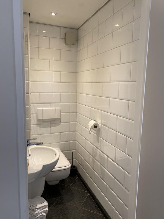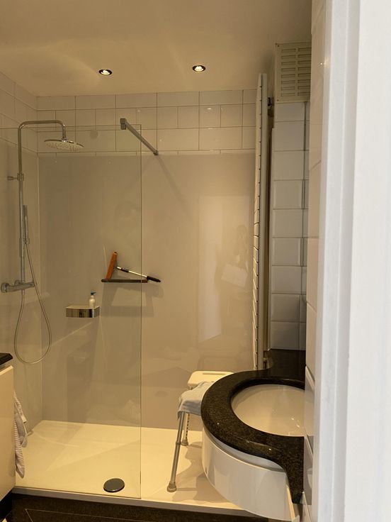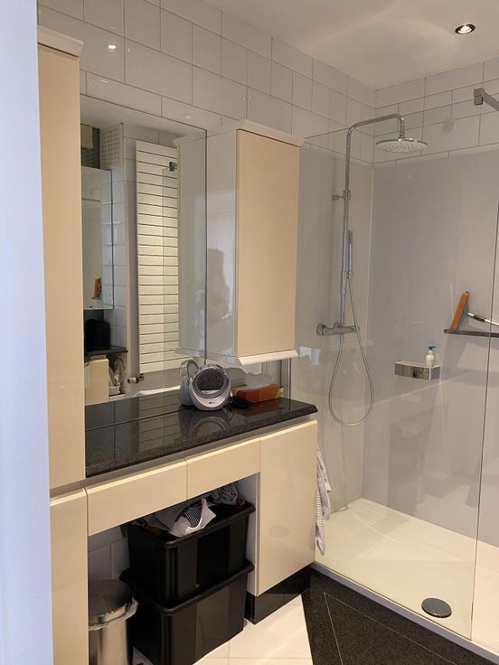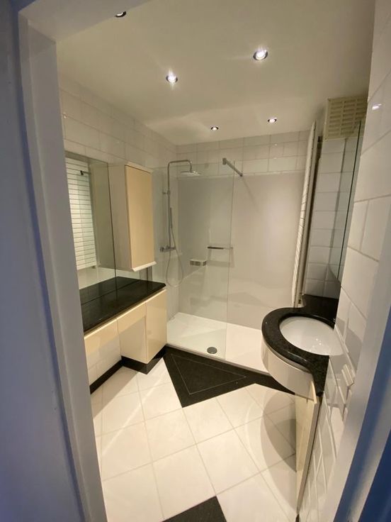De gerenoveerde badkamer is plafondhoog betegeld, beschikt over lavabomeubel en een douche. Er is een aparte WC,ruimte, de muren ook volledig betegeld.