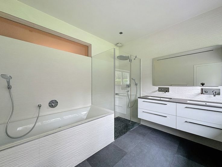 Sint-Genesius-Rode grenst aan Ukkel, prachtige gelijkvloerse villa met een totale oppervlakte van ± 230 m² op een perceel van 12,6 are gelegen in een groene omgeving. De woning biedt mooie volumes en bestaat uit een grote en lichte woonkamer (± 50 m²), een mooie volledig ingerichte keuken (± 15 m²), 4 mooie slaapkamers (± 17,90 m², ± 17,80 m², ± 15,20 m² en ± 12,20 m² ) inclusief de master suite met aangrenzende complete badkamer, 2 doucheruimtes en een toilet. Mooi terras met uitzicht op een grote tuin (± 450 m²) perfect gelegen op het zuidwesten. Tevens een prachtige voortuin met uitzicht op de woning. Inpandige garage (automatische deur) alsmede diverse parkeerplaatsen op de oprit. Viessman gasboiler, dubbele beglazing, elektrische rolluiken in elke kamer en veel bergruimte. Alle kosten zijn individueel. PEB D. Om zonder verder uitstel te ontdekken!!
