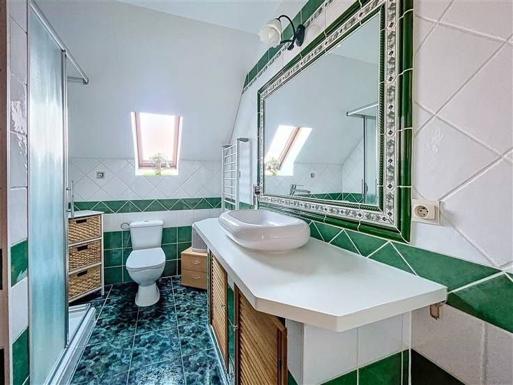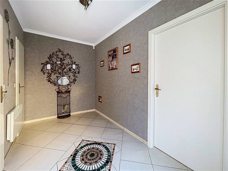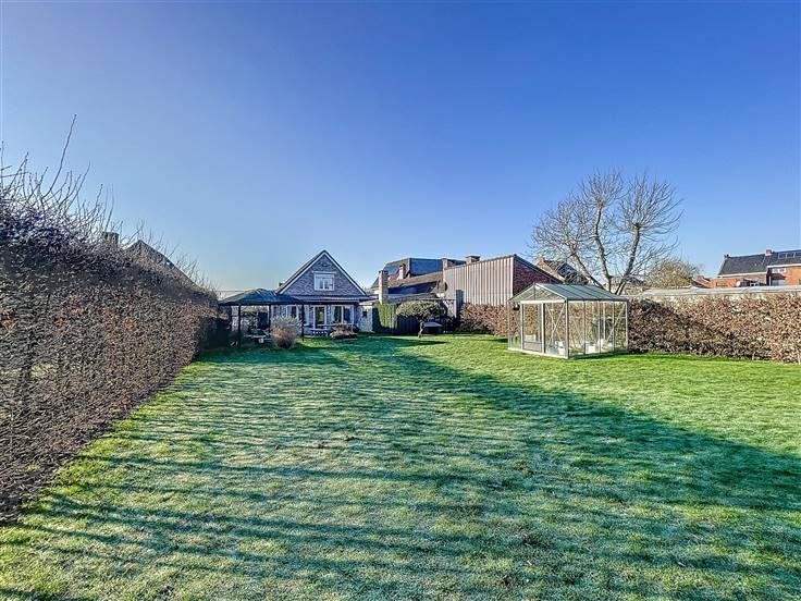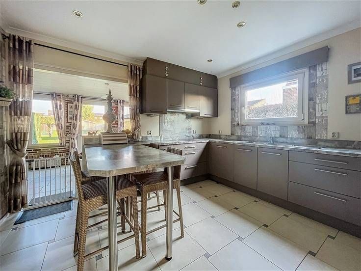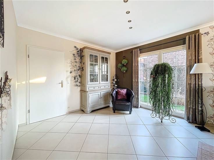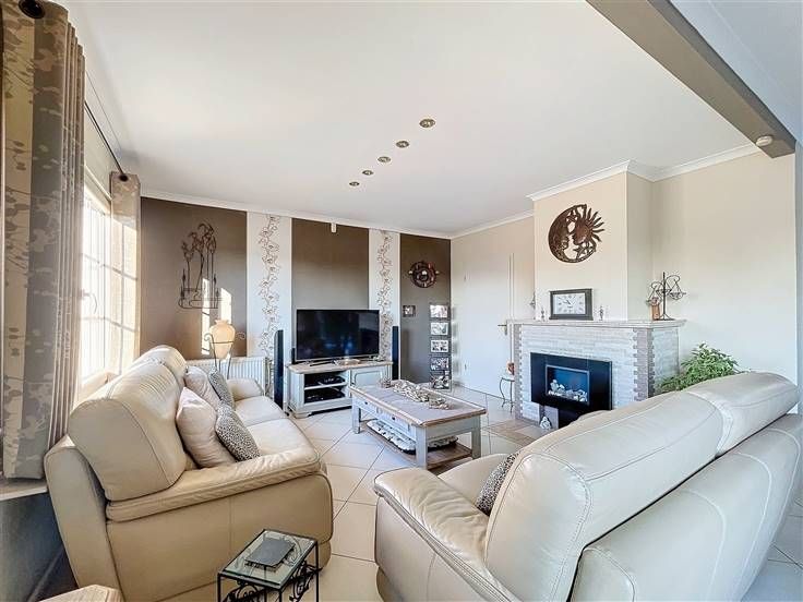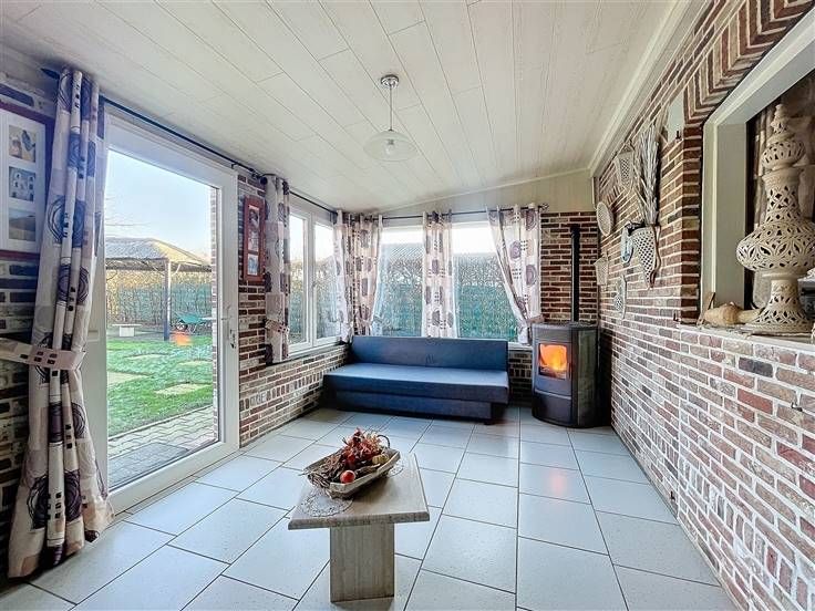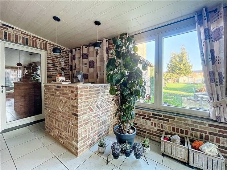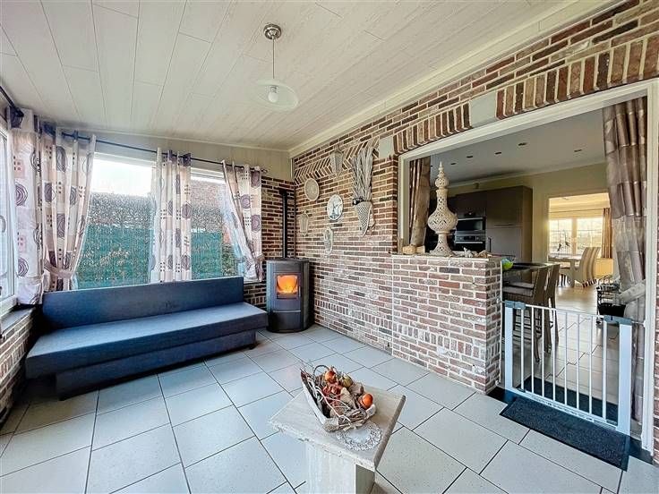 Rez: hall d'entrée, wc séparé, salon, vaste living, cuisine équipée, bureau avec point d'eau, chambre, buanderie, véranda avec poêle à pellet.