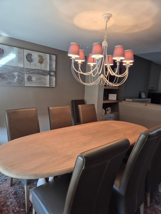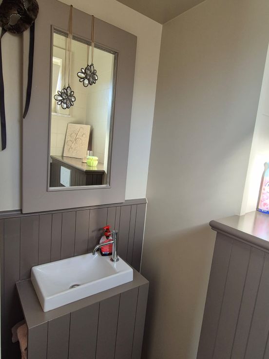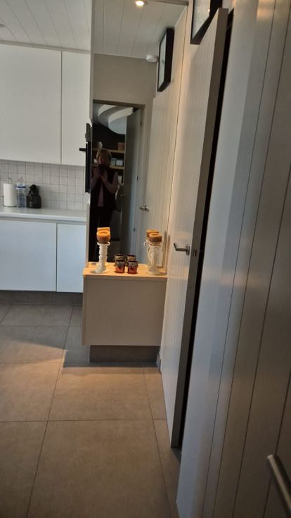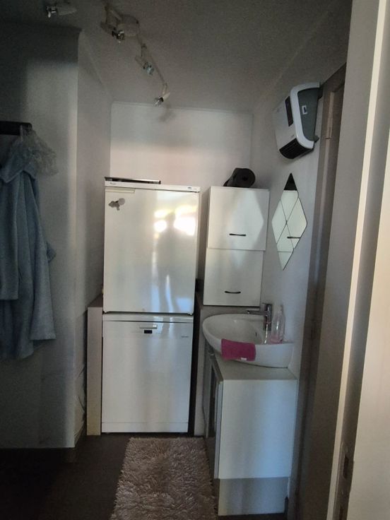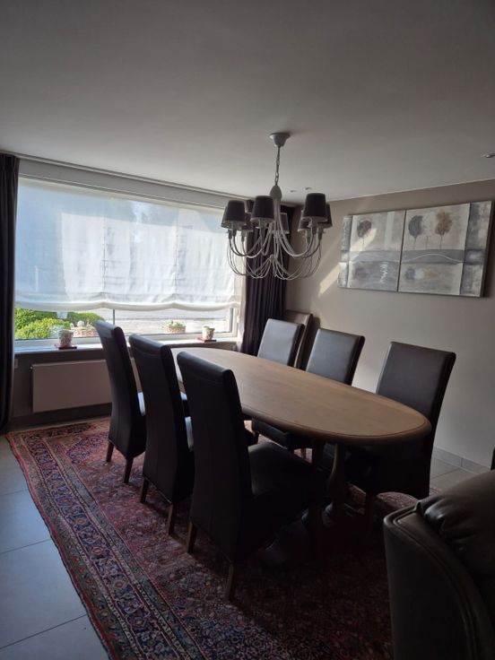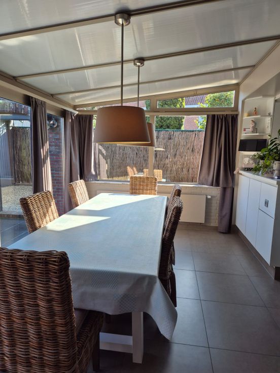 Gelijkvloers: inkom met gastentoilet + lavabo - gezellige living met gascassette, eetruimte + keuken (frigo, oven, inductiekookplaat) - aansluitend keukenberging (douche, lavabo, bergruimte, toegang tot kelder) - veranda (plaats voor lange tafel) - CV op aardgas - kelder - grote bergruimte met wasmachine en droogkast.