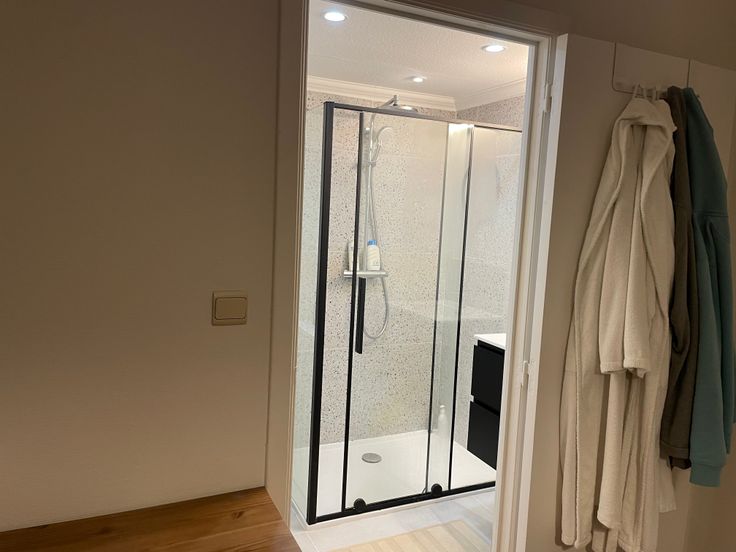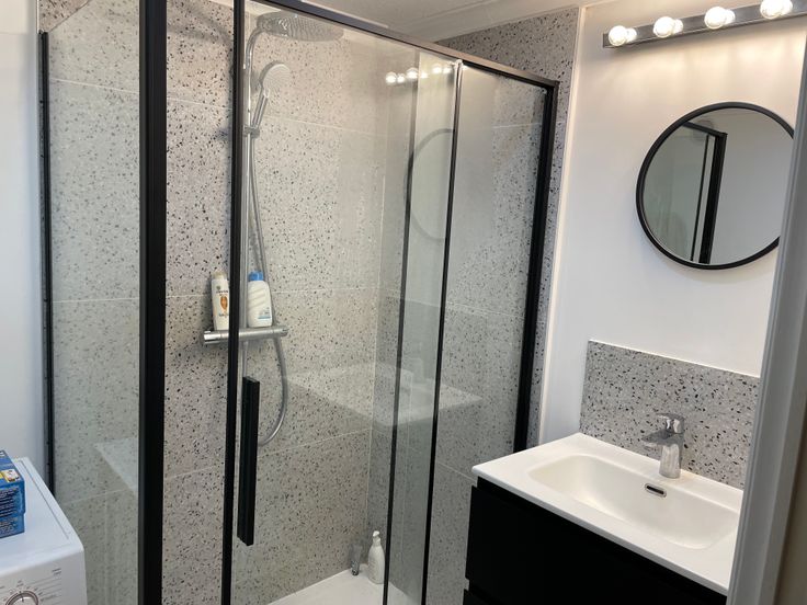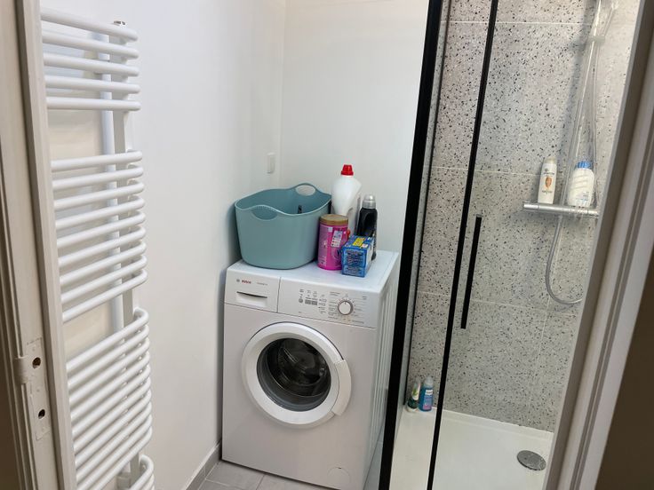 Een aparte badkamer met een douche en een wasmachine.