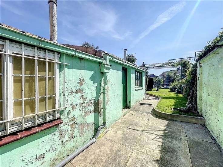 Passage latéral, terrasse, remises et jardin.
