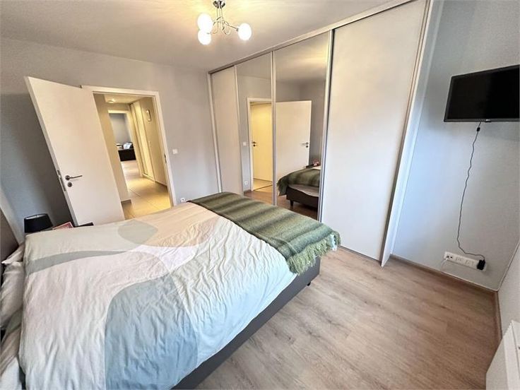 L'appartement est entièrement meublé et se compose de 2 chambres (une chambre avec lit double et la seconde chambre lit simple), d'un grand living lumineux muni de volets électriques, d'une cuisine super équipée ouverte (plaques, four, hotte aspirante, réfrigérateur, congélateur, lave-vaisselle, micro-ondes,...) avec îlot, d'une salle de bain avec baignoire et douche, d'un wc séparé, d'une buanderie avec lave-linge et sèche-linge, et d'un balcon.