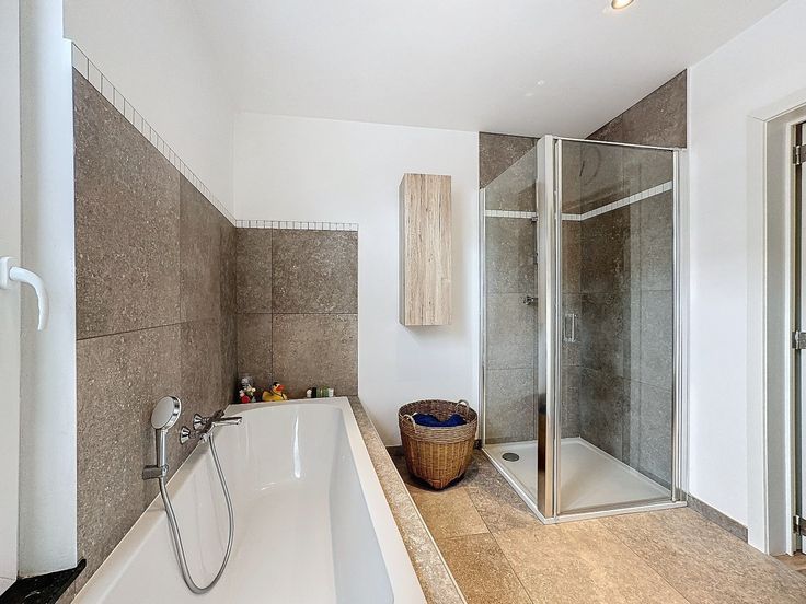 Eerste verdieping: nachthal, 1 slaapkamer, badkamer met ligbad, douchecabine, dubbele lavabo, afzonderlijk toilet, wasplaats.