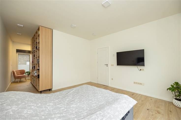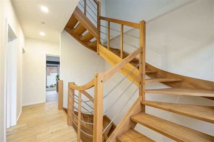 Hoogwaardig gerenoveerde, energiezuinige woning met 4 ruime slaapkamers, garage, tuin én dakterras De woning heeft op elke verdieping vloerverwarming en is voorzien van zonnepanelen. Je komt binnen in de inkomhal met links een technische berging en een eerste badkamer. In de hal die naar de leefruimte leidt, heb je een ingemaakte kast met de garage erachter. De open leefruimte en keuken achteraan trekken het licht royaal binnen. De strakke leefkeuken heeft een keukeneiland is voorzien van een inductievuur, dampkap, spoelbak, vaatwasser, heel wat kasten. In de keukenwand achteraan vind je dubbele Amerikaanse koelkast, een oven, microgolfoven en een bordenverwarmer. De tuin met z’n betegelede terras is een heerlijke buitenruimte. De open houten trap in de leefruimte brengt je naar de eerste verdieping met een apart toilet. De glazen deur aan de zijkant geeft toegang tot een groot, betegeld dakterras. De eerste slaapkamer bevindt zich aan de straatkant. De master-bedroom aan de tuinzijde heeft een op maat gemaakte ensuite dressing én een dubbele glazen deur die uitgeeft op het dakterras! Je hebt hier op het eerste ook nog een badkamer, met een inloopdouche en een lavabomeubel met spiegelkast. Op de tweede en bovenste verdieping heb je nog twee zeer ruime slaapkamers en een grote, derde badkamer. Extra handig: de slaapkamers zijn voorzien van airco, net als in de leefruimte! Voor meer info: https://www.immovasta.be/panden/gegevens/13531/