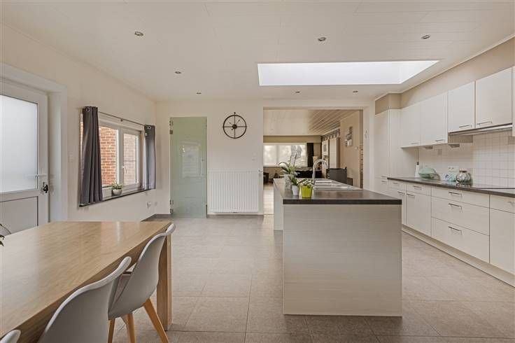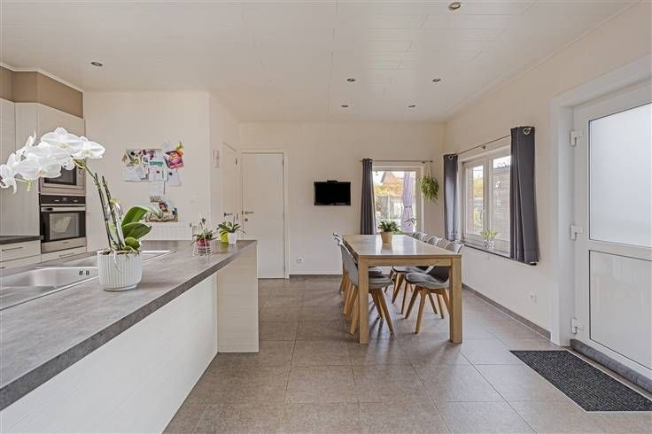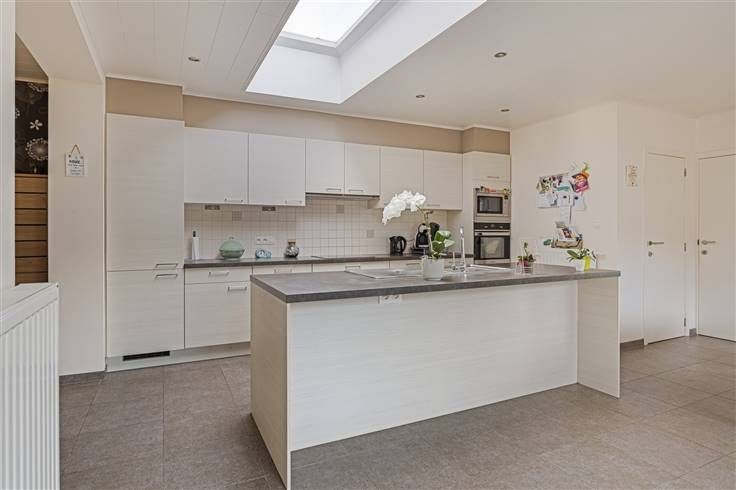 Aansluitend aan de woonkamer bevindt zich de ruime halfopen keuken (40m²). De keuken is voorzien van al het nodige comfort: er is een kookvuur met dampkap, een dubbele spoelbak, een afwasmachine, een microgolf, een oven en een ingemaakte frigo. Er is voldoende ruimte voor een grote eettafel.