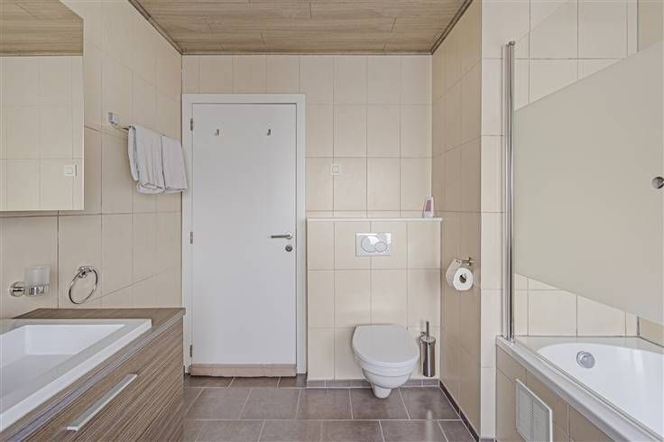 Op de eerste verdieping bevinden zich nog twee ruime slaapkamers (12m² en 15m²) en een badkamer (8,50m²). De badkamer is voorzien van een douche-bad, een lavabo en een tweede toilet.