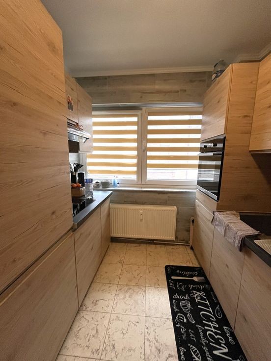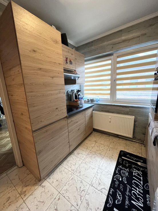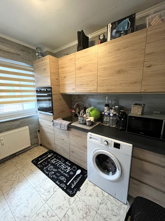 Hall d'entrée, WC séparé, living, cuisine (frigo, congélateur, four, taque vitro céramique, hotte, évier, emplacement pour la machine à laver), hall avec placards, salle de bain (évier, douche, radiateur sèche-serviette), deux chambres à coucher.