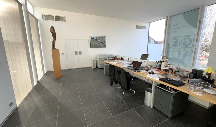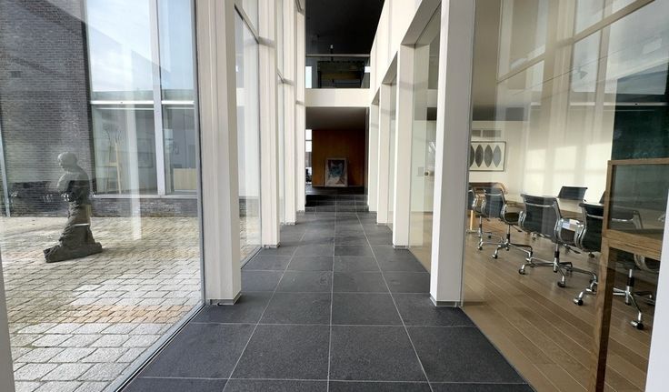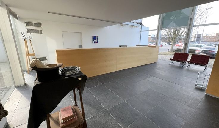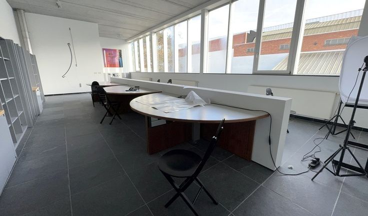 Specificaties: ingedeelde en gemeubelde kantoorruimte keuken met refter en privatief sanitair H/Daluminium schrijnwerk met dubbele beglazing en elektrische zonwering, open zoldering en gyproc plafond met opbouw- en inbouw led-armaturen, parketvloer en natuursteen vloer, databekabeling en telenetaansluiting, cv op gas en airco, mechanische ventilatie, inbraakalarm en parlofoon, rookdetectie, binnentuin met terras, mogelijkheid tot publiciteit op totem, 10 bovengrondse parkeerplaatsen, 3 garageboxen en bezoekersparking