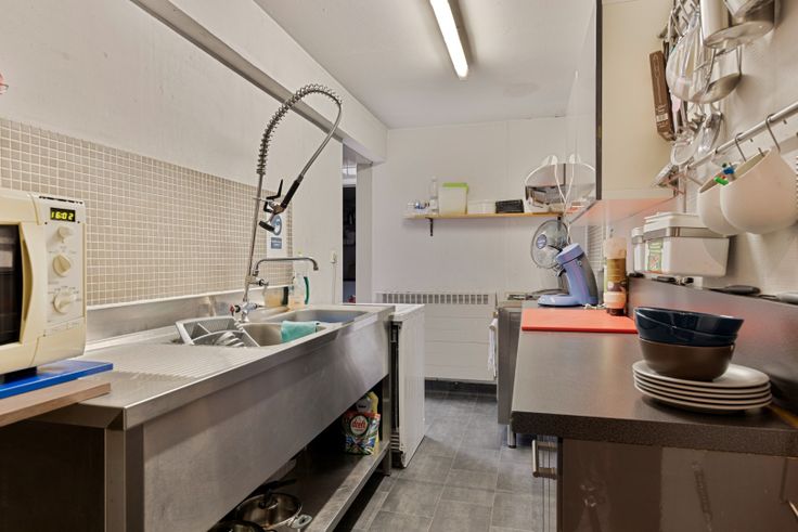 Het gebouw beschikt over een woonst boven de zaak. Het beschikt over een leefruimte, zithoek en 1 slaapkamer. Op het gelijkvloers tref je een zeer verzorgd frituur aan met de nieuwste installaties die volledig aan de normen voldoen. Er is voldoende zitplaats binnen en buiten. Het sanitair is verzorgd en er is een mooie bijkeuken aanwezig. Verder zijn er verschillende bergingen, wasruimte en garage. Ook is er nog een goed onderhouden badkamer.