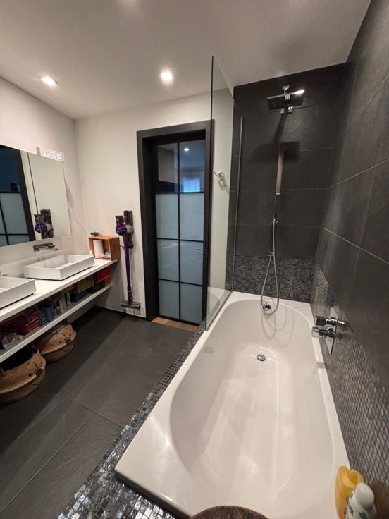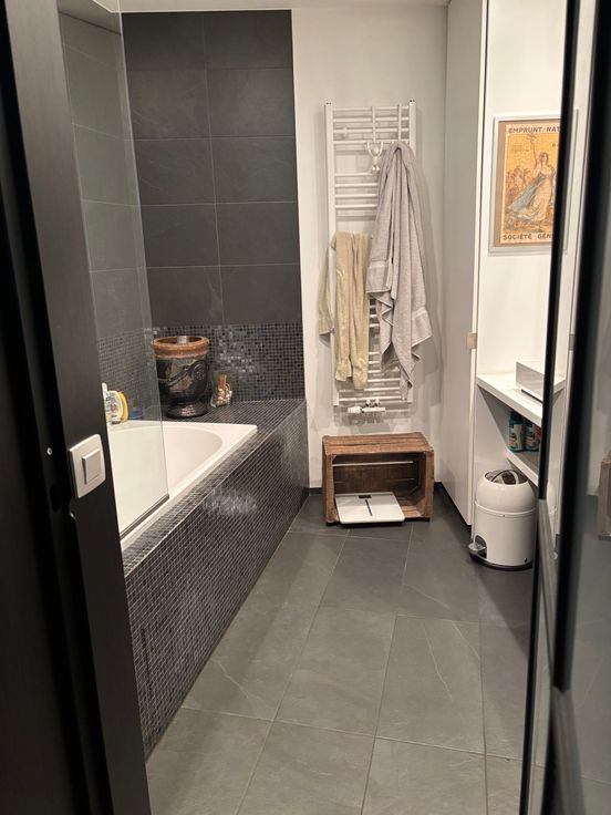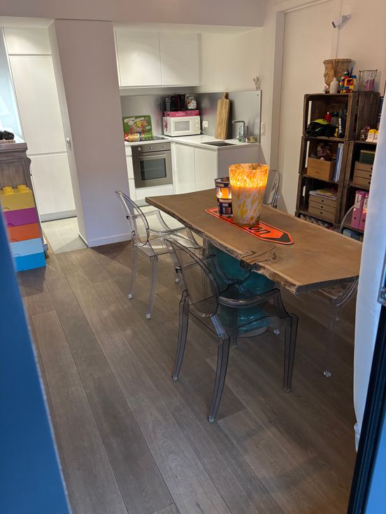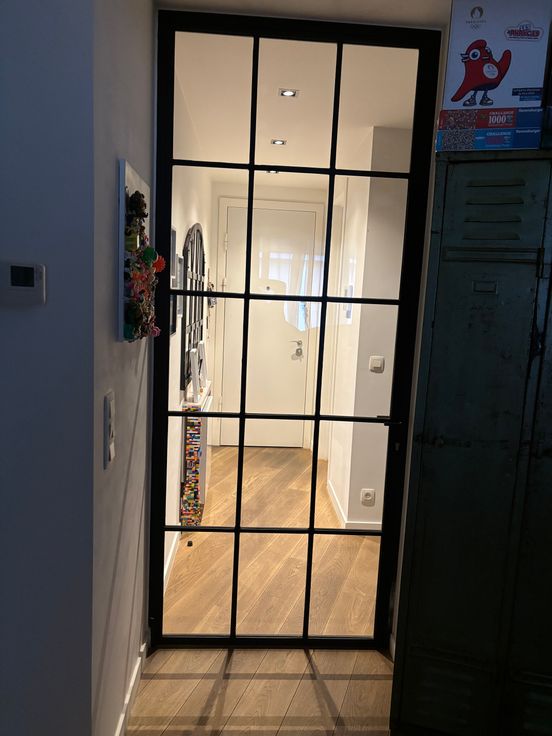 Il se compose comme suit : un hall avec un toilette et un espace buanderie dans un placard aménagé avec porte verrière style atelier d’artiste. Faisant suite une spacieuse pièce de vie avec une cuisine américaine hyper-équipée (électroménagers SMEG et Novy) d’environ 35m2 et d’une belle chambre de 15m2 avec placard dressing et une salle de bain (robinetterie Gessi) baignoire (Villeroy), double vasques (Alape) avec porte verrière.